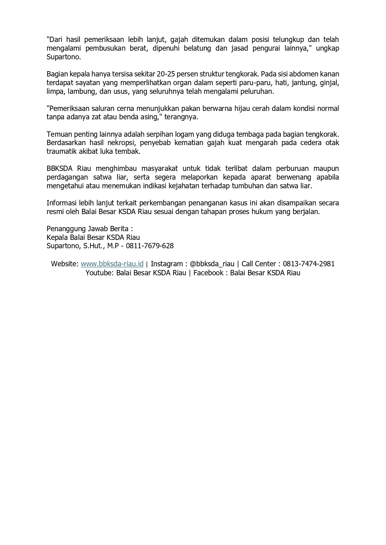 Penanggung jawab berita : Kepala Bagian Tata Usaha Balai Besar KSDA Riau