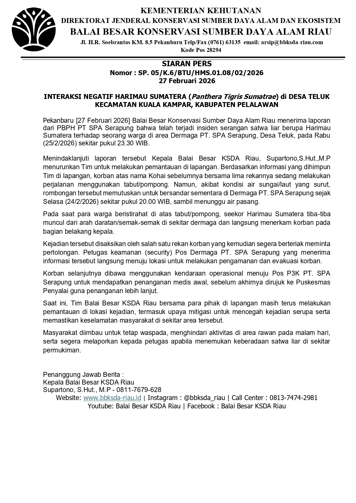 Pekanbaru [27 Februari 2026] Balai Besar Konservasi Sumber Daya Alam Riau menerima laporan dari PBPH PT SPA Serapung bahwa telah terjadi insiden serangan satwa liar berupa Harimau Sumatera terhadap seorang warga di area Dermaga PT. SPA Serapung, Desa Teluk, pada Rabu (25/2/2026) sekitar pukul 23.30 WIB.